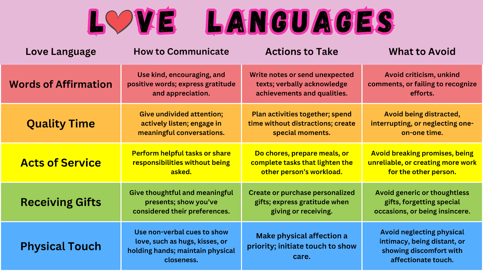 - Or someone may be planning weekly date nights (quality time) while their partner is longing to hear “I love you” out loud (words of affirmation).